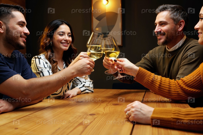 Группа молодых взрослых и людей среднего возраста, выпивающих винные бокалы