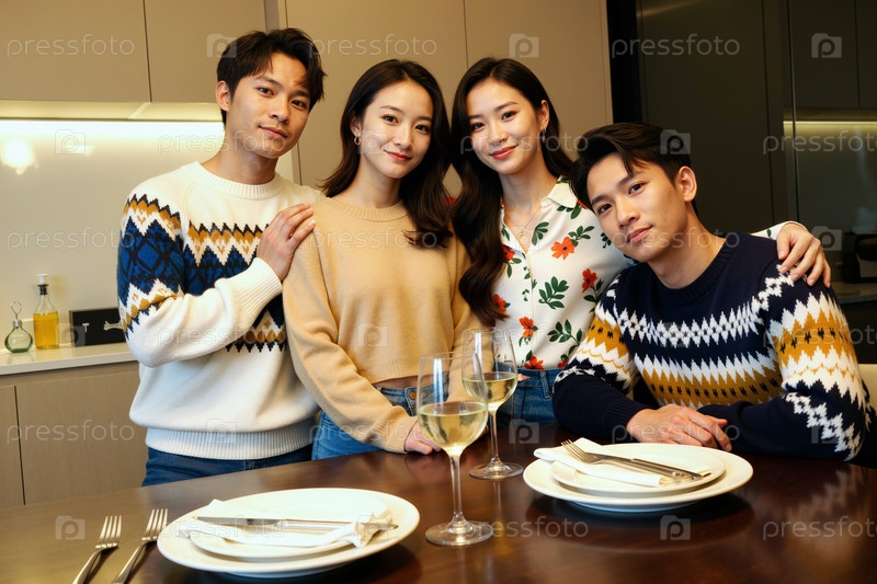 Группа молодых взрослых восточноазиатских друзей, улыбающихся и позирующих вместе в помещении