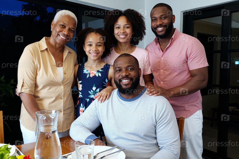 Мультиэтническая семья улыбается вместе вокруг обеденного стола в помещении