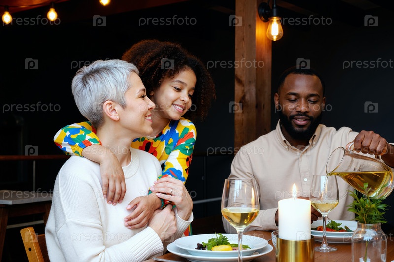 Мультиэтническая семья наслаждается ужином вместе в ресторане Улыбаясь и взаимодействуя