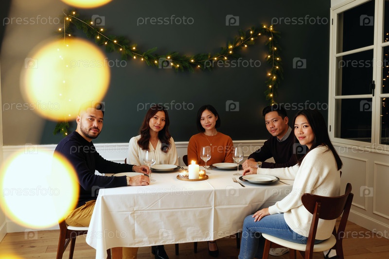 Группа молодых взрослых азиатских друзей, собирающихся за столом и празднующих отпуск