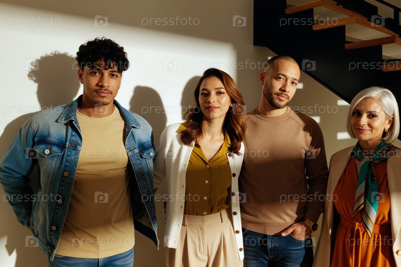Разнообразная группа молодых взрослых и людей среднего возраста, стоящих в помещении с улыбкой