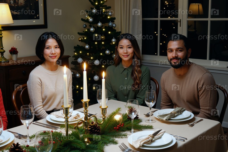 Молодые взрослые мультиэтнические друзья сидят вместе, празднуя рождественский ужин