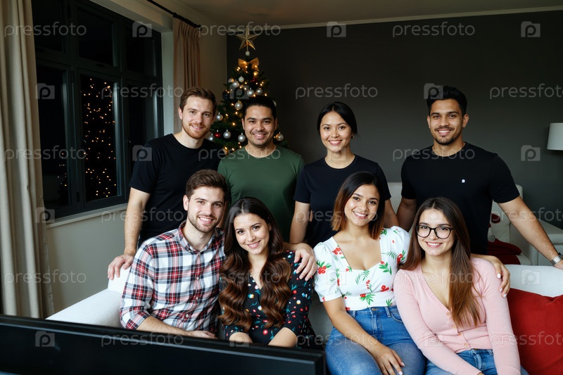 Разнообразные молодые взрослые, улыбающиеся вместе во время празднования Рождества в помещении