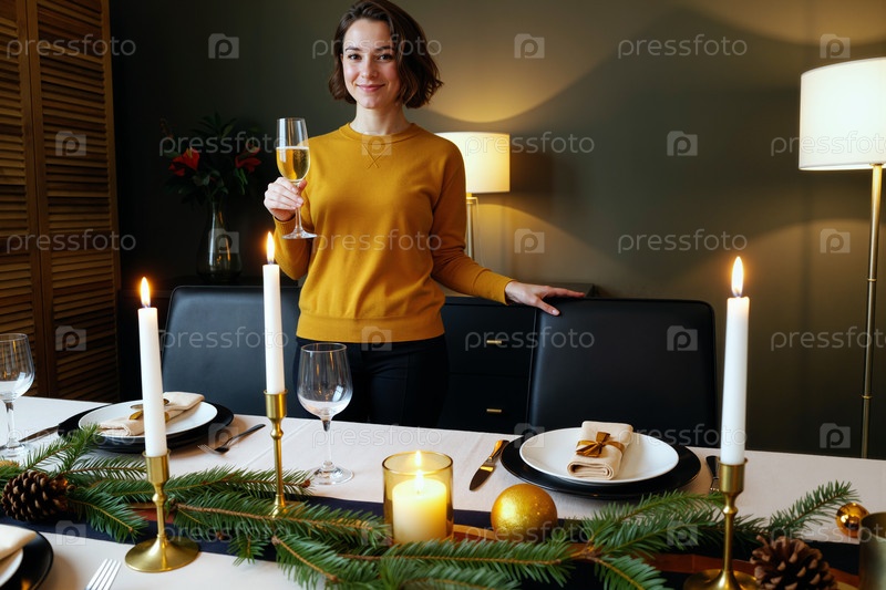 Портрет молодой взрослой женщины, улыбающейся в то время как она держит бокал шампанского