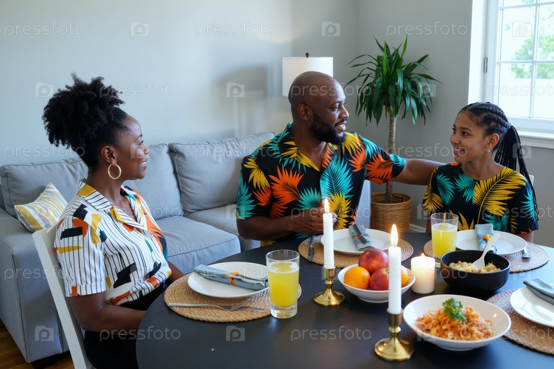 Черная семья наслаждается ужином вместе дома в современной обстановке гостиной