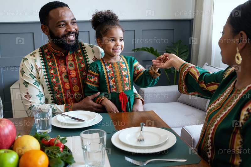 Черная семья наслаждается праздничной трапезой вместе за обеденным столом улыбаясь