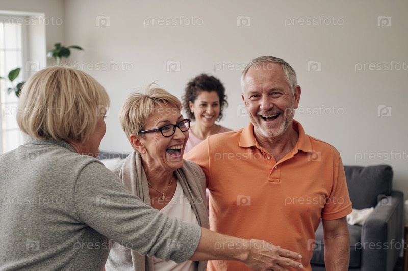 Группа друзей среднего возраста, смеющихся и общающихся в помещении
