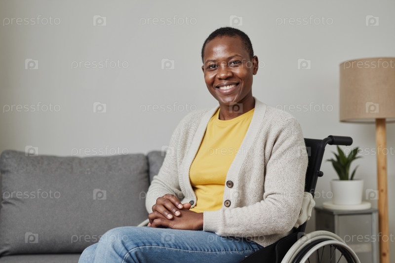 Портрет молодой взрослой чернокожей женщины с инвалидностью, улыбающейся в помещении