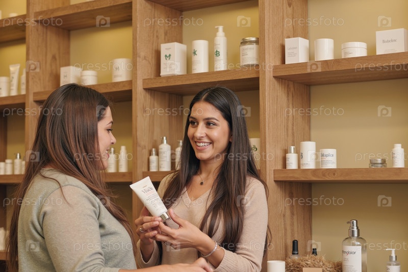 Молодые взрослые испаноязычные женщины улыбаются, обсуждая продукт по уходу за кожей в магазине