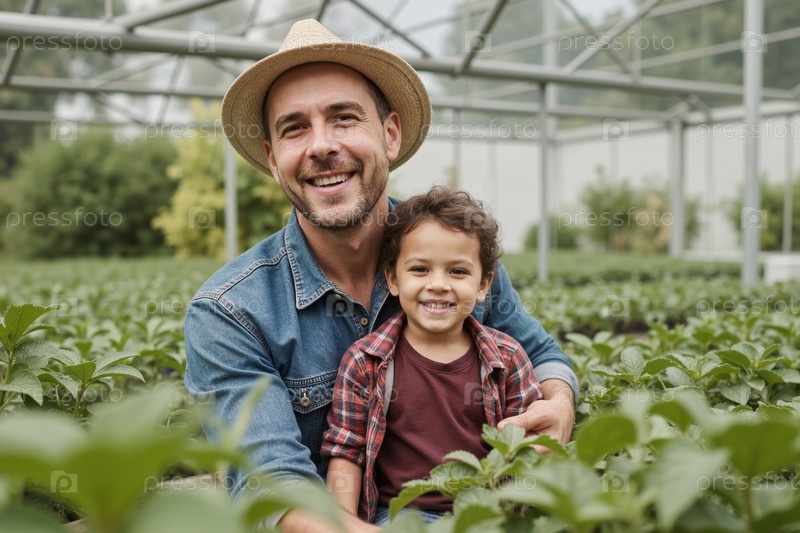 Мужчина средних лет и ребенок, улыбающиеся вместе в тепличном саду