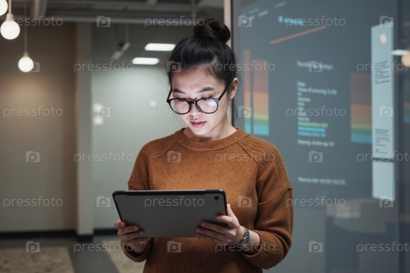 Молодая взрослая азиатская женщина использует планшет Digal, анализируя визуализацию