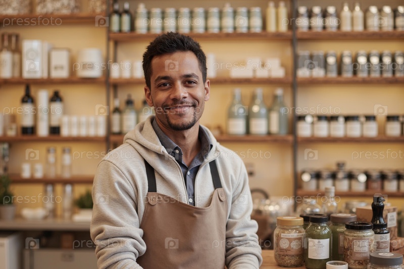 Портрет молодого взрослого чернокожего мужчины, улыбающегося во время работы в органическом магазине