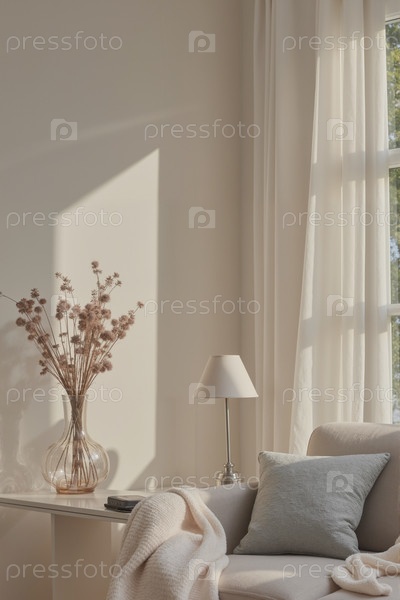 Солнечный свет освещает уютный уголок гостиной с декоративными сушеными цветами