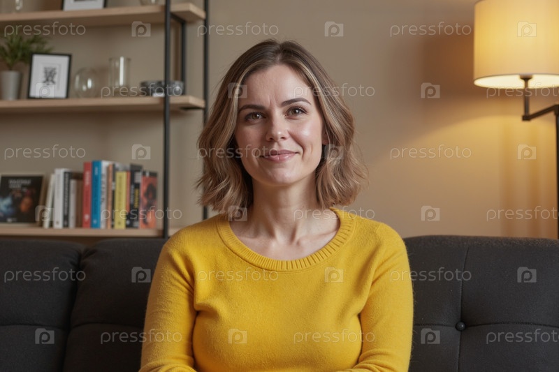 Портрет молодой взрослой женщины, улыбающейся во время сидения в помещении