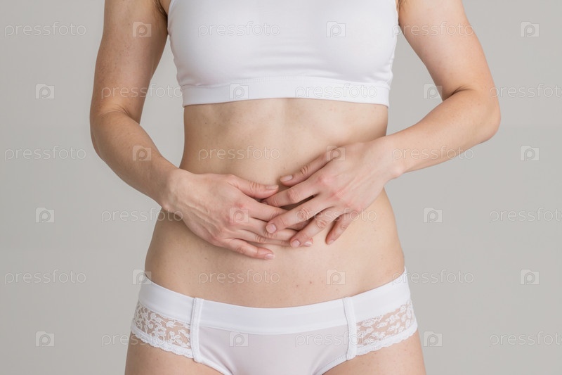 Молодая взрослая женщина прикасается к желудоку испытывает боли в животе