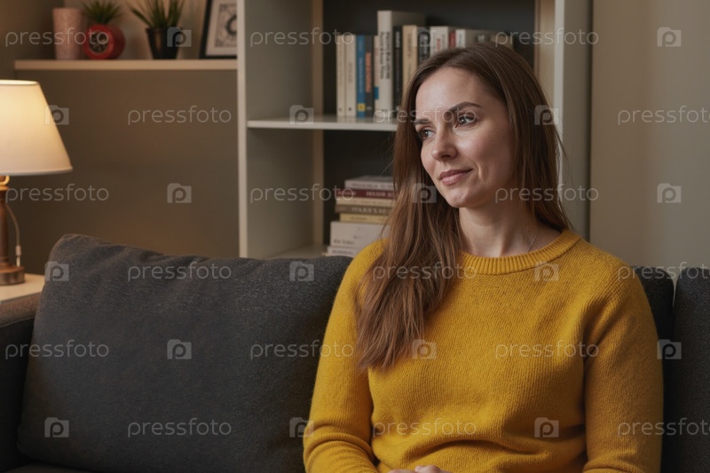 Молодая взрослая женщина, сидящая на диване, выглядит вдумчивой внутри