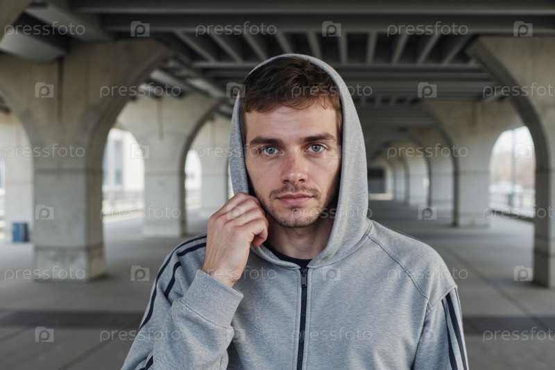 Портрет молодого взрослого мужчины в хаусине, стоящего под мостом