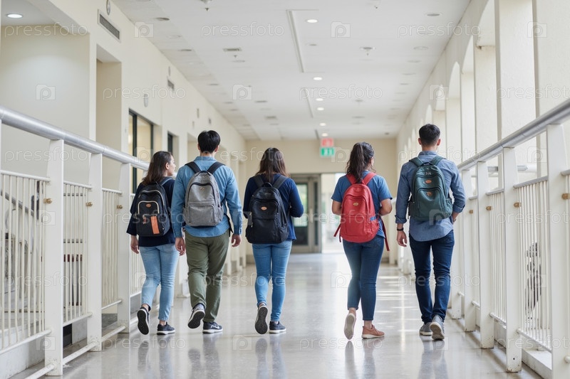 Группа многонациональных подростков, идущих по школьному коридору с рюкзаками