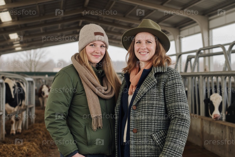 Портрет двух молодых взрослых женщин, улыбающихся на молочной ферме