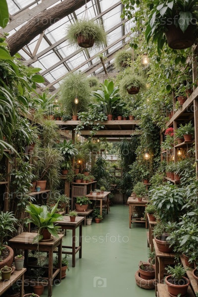 Роскошный тепличный интерьер с обильными горшковыми растениями и висящим листьем