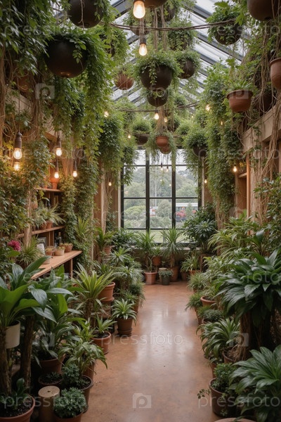 Плодородная крытая теплица, наполненная висящими и горшечными тропическими растениями