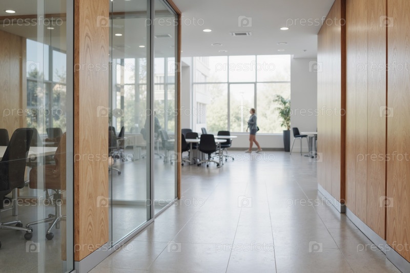 Молодая взрослая женщина гуляет по современному офисному коридору