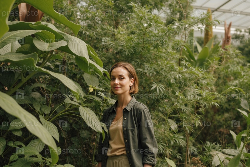 Портрет молодой взрослой женщины, стоящей и улыбающейся в тепличном саду