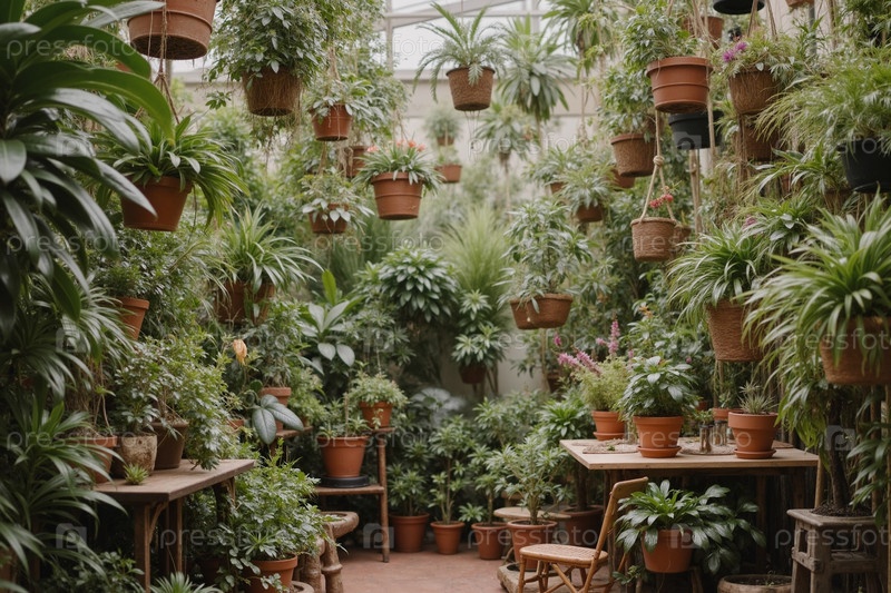 Роскошный тепличный интерьер с висящими и горшечными растениями, которые процветают в помещении