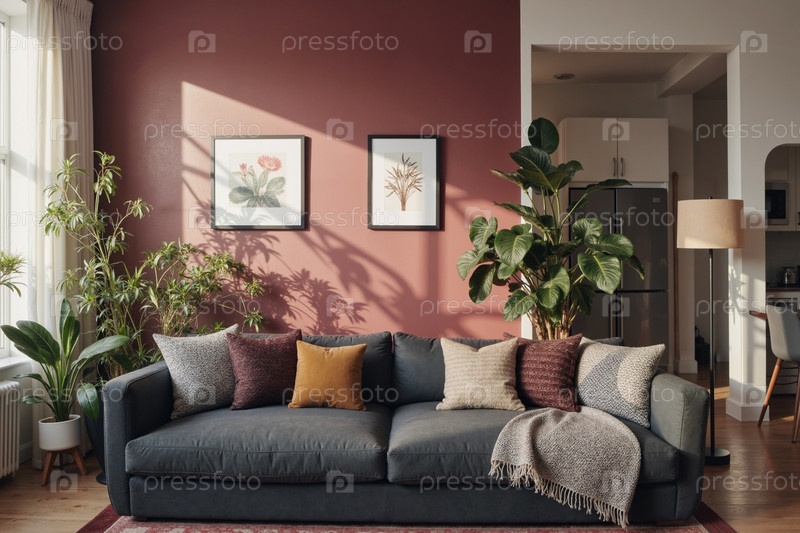 Современный интерьер гостиной с диваном и декоративными комнатными растениями