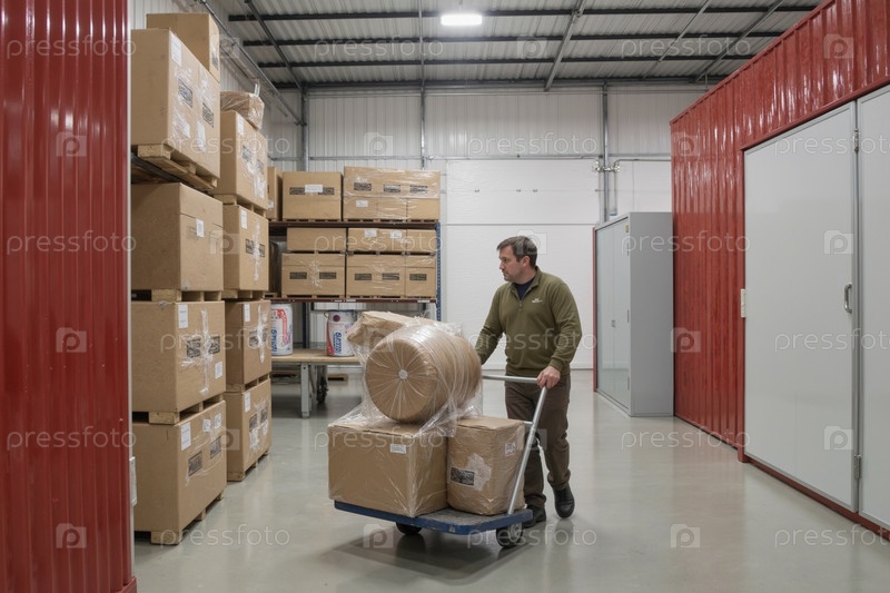 Человек среднего возраста перевозит коробки на тележке в складе