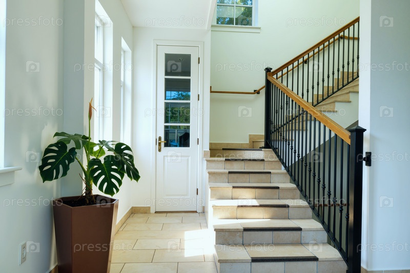 Пустая жилая лестница с потоком солнечного света через большие окна