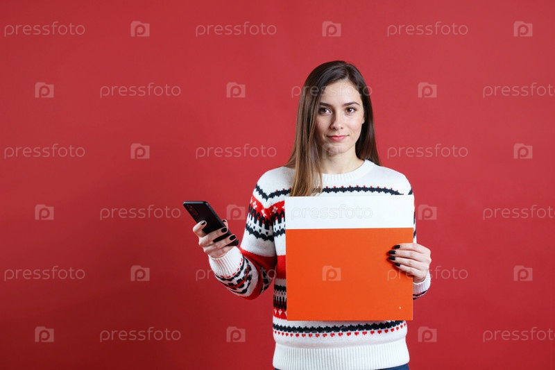 Молодая женщина держит смартфон и папку, стоя на красной стене