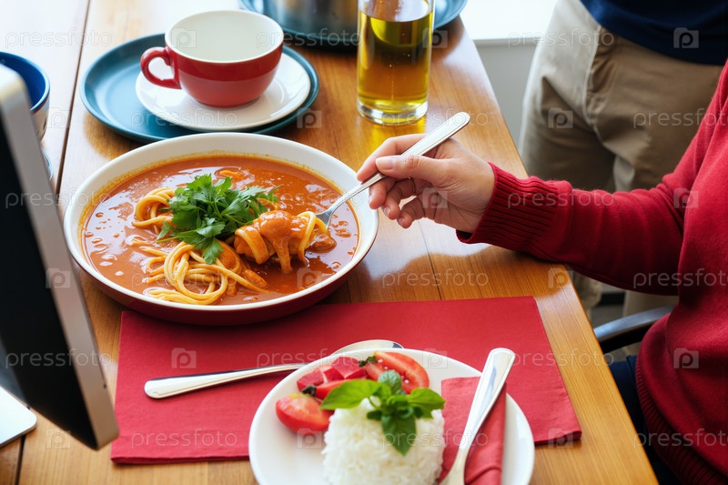 Молодая взрослая женщина ест спагетти с томатным соусом за столом