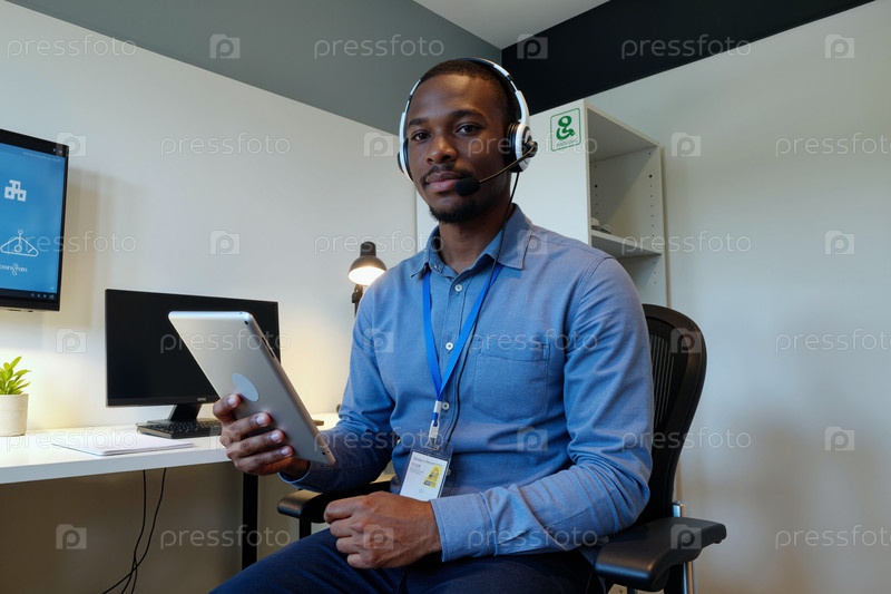 Портрет молодого взрослого чернокожего мужчины, использующего планшет и гарнитуру в офисной обстановке