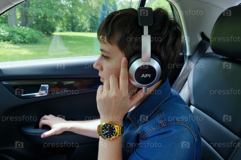 Подросток слушает музыку с наушниками в машине