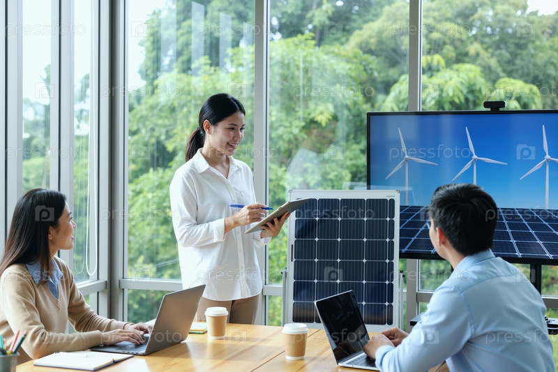 Молодая азиатская женщина представляет коллегам проект по возобновляемой энергии в помещении