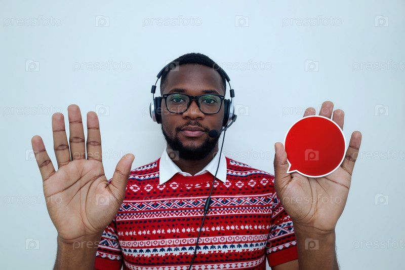 Портрет молодого взрослого чернокожего мужчины, носящего наушники и держащего красный пузырь речи