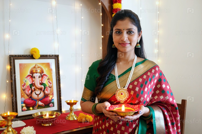 Портрет молодой взрослой южноазиатской женщины, празднующей традиционный фестиваль в помещении