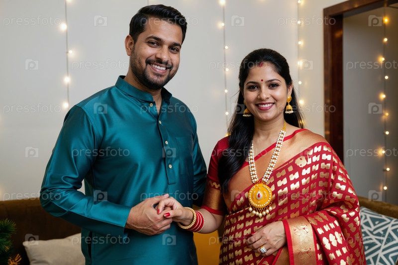Южноазиатская молодая взрослая пара улыбается и держит друг друга за руки в помещении