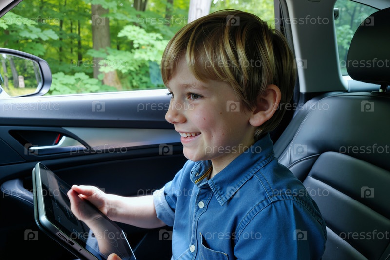 Улыбающийся при использовании цифрового планшета мальчик сидит внутри машины