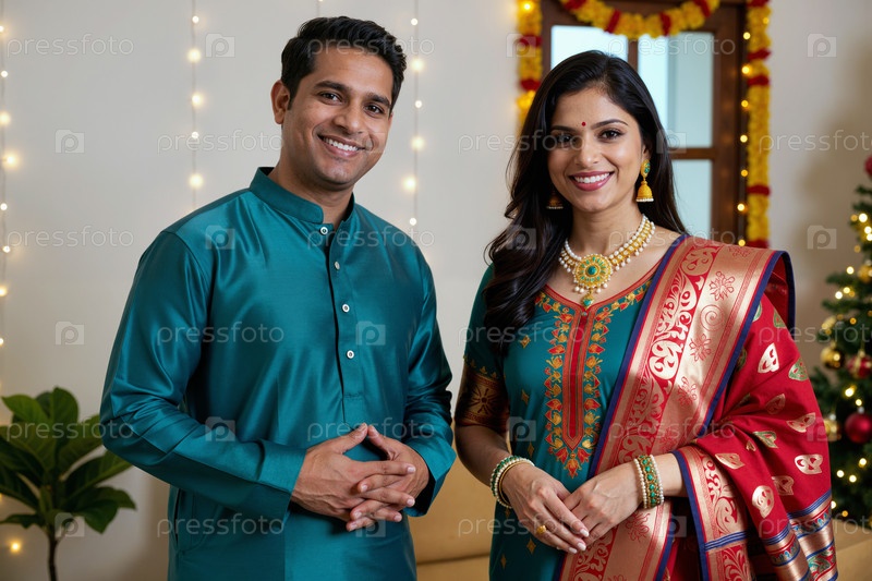 Портрет молодой взрослой южноазиатской пары, улыбающейся во время праздничного торжества