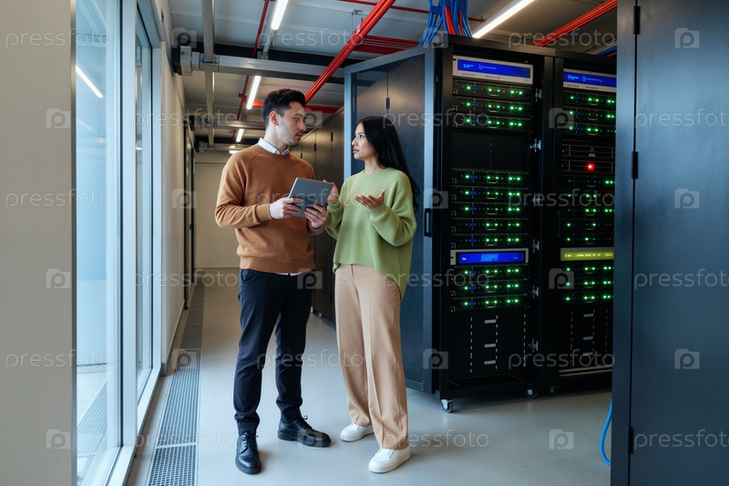 Молодой мужчина и молодая азиатская женщина обсуждают данные в серверной комнате