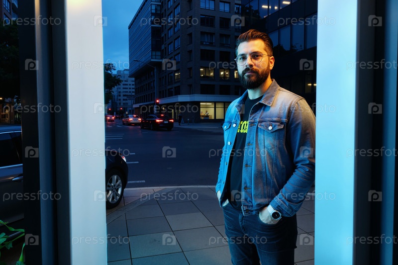 Молодой взрослый мужчина уверенно стоит на городской улице вечером