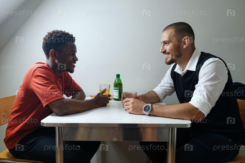 Молодой взрослый чернокожий мужчина и молодой взрослый мужчина улыбаются во время разговора