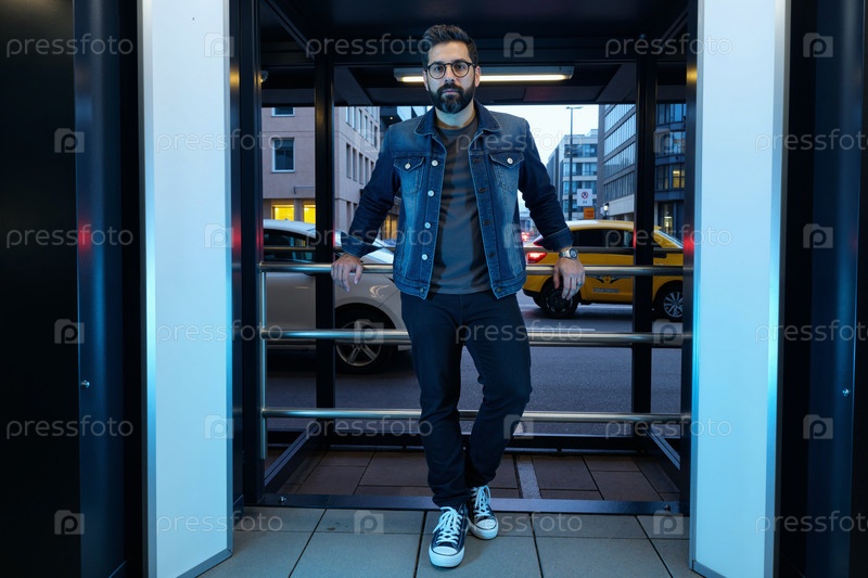 Портрет молодого взрослого мужчины, уверенно стоящего в городской обстановке