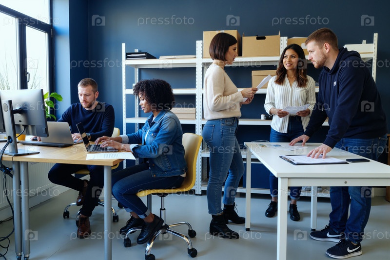 Мультиэтнические молодые взрослые сотрудничают над проектом в современной офисной обстановке