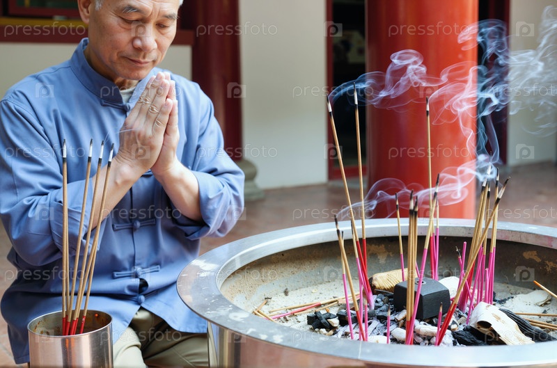 Старший азиатский мужчина молится с палочками фимиама в традиционной храмовой обстановке