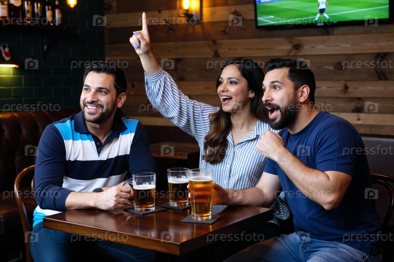 Молодые мужчины и женщины празднуют, наблюдая за спортивными играми в помещении