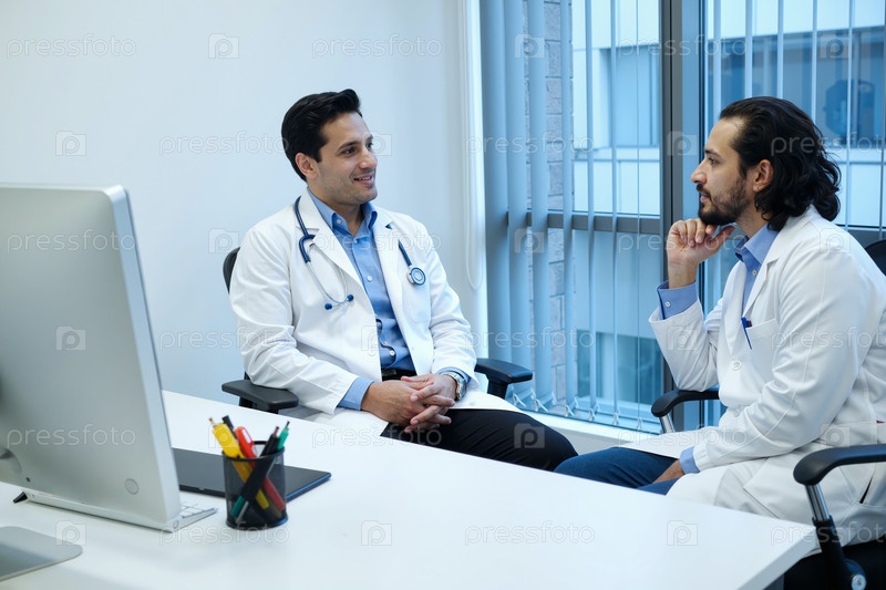Два молодых взрослых врача-мужчины обсуждают случай пациента в офисе